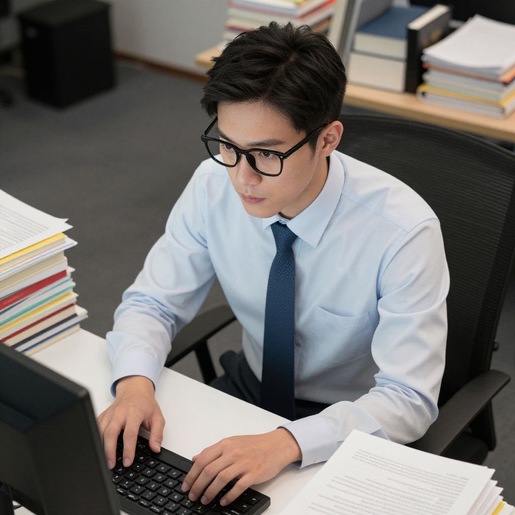 A photograph of a young Asian man with short black hair and black-framed glasses, wearing a white dress shirt and dark blue tie. He is seated at a black office chair, focused on a computer keyboard in front of him. Stacks of colorful papers and books are visible in the blurred background, suggesting an office or study setting. His expression is serious and concentrated. The image has a slightly overexposed and high-contrast effect, emphasizing the subject's face and hands while creating a bright white highlight on the papers.