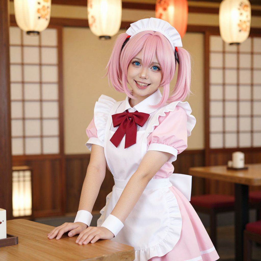 Photorealistic digital artwork of a smiling young woman with pink twintails, blue eyes, and fair skin, dressed in a white French maid outfit with a pink dress and red bow. She leans on a wooden table in a traditional Japanese restaurant with shoji screens and warm, hanging lanterns. Her white headband and wrist cuffs complement her maid uniform. The background features wooden paneling and tables with candles. The lighting is soft, enhancing the warm, cozy atmosphere.