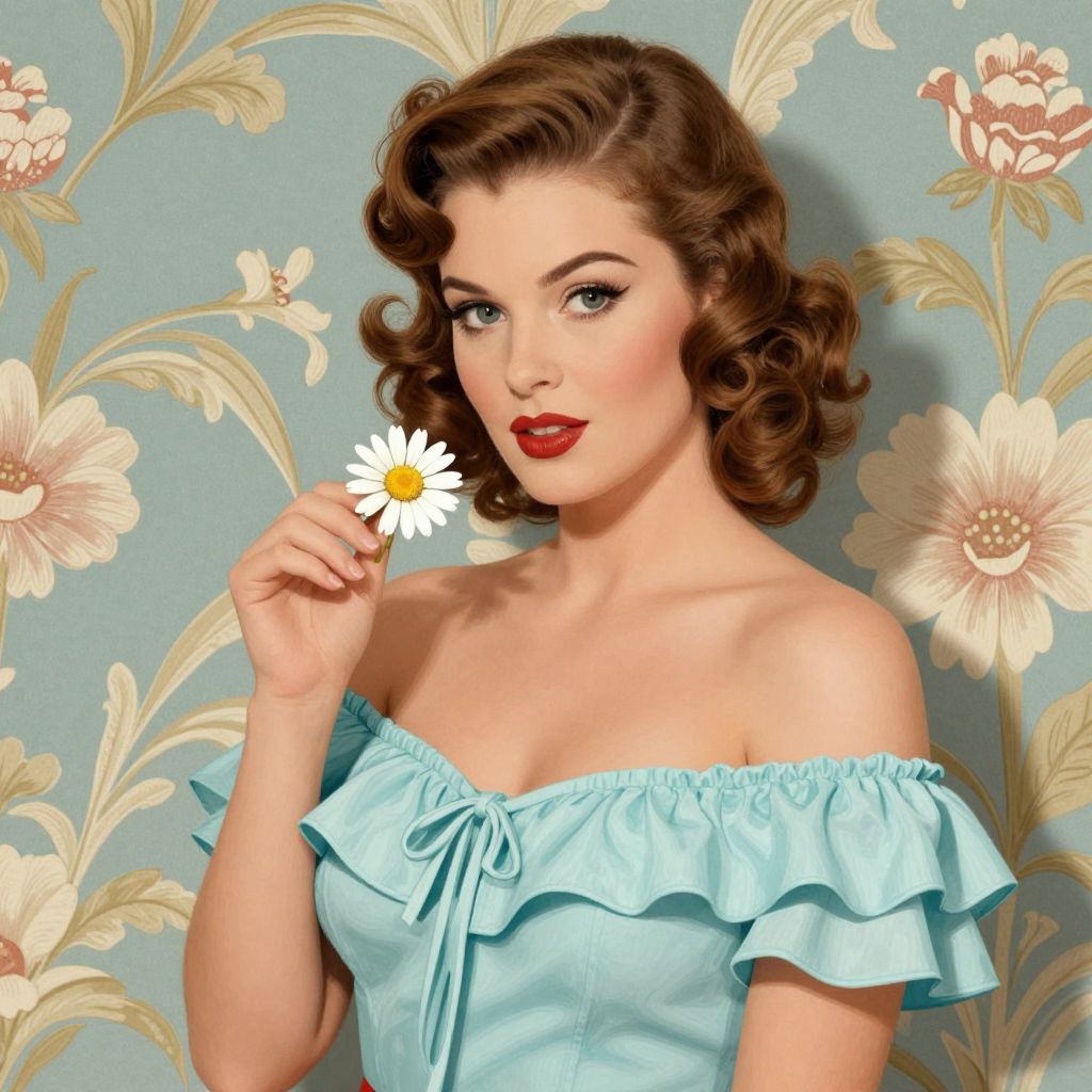 This is a digitally illustrated image of a fair-skinned woman with wavy, brown, 1950s-style hair, wearing an off-the-shoulder, light blue dress with ruffled sleeves. She is holding a white daisy with a yellow center near her lips, which are painted red. Her makeup includes dark eyeliner and mascara, accentuating her blue eyes. The background features a vintage floral pattern with large, pale pink and white flowers on a light blue wall. The image has a retro, pin-up style and exudes a nostalgic, classic charm.