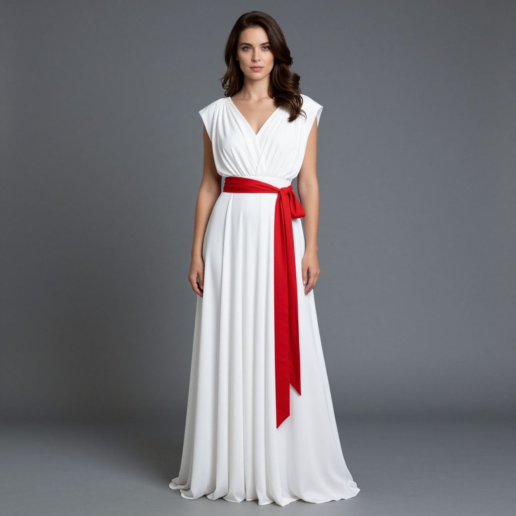 Photograph of a woman with long, wavy dark brown hair, standing against a solid gray background. She is wearing a sleeveless, V-neck, white gown with a flowing, pleated skirt. A vibrant red sash is tied around her waist, contrasting sharply with the white fabric. She has a neutral expression and is looking slightly to the right. The lighting is even, highlighting the texture of the gown and the boldness of the red sash. The overall style is elegant and minimalist.