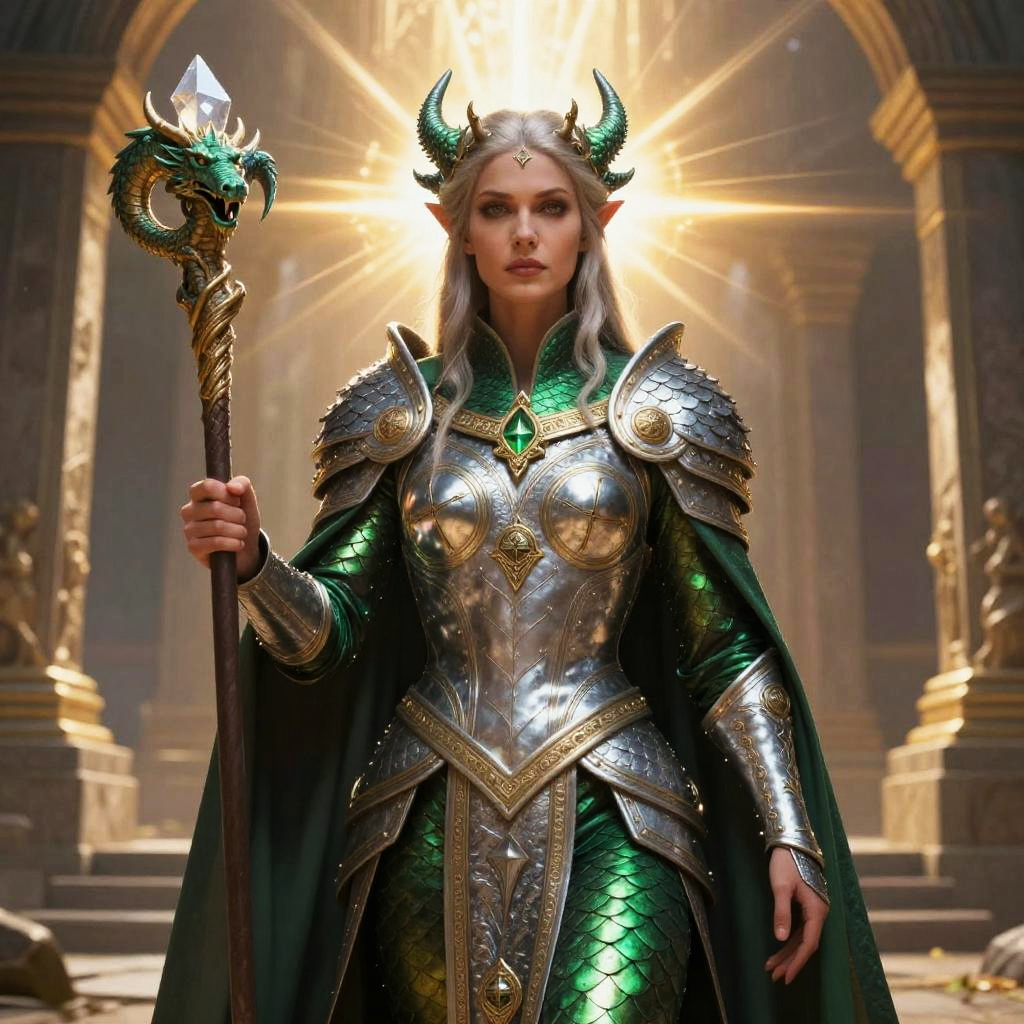 This is a highly detailed, digital fantasy artwork of a regal female dragon warrior. She stands in a grand, sunlit hall with ornate arches and stone columns in the background. The woman has long, silver hair, pointed ears, and wears a metallic crown with green, glowing horns. Her armor is silver with intricate gold patterns, covering her chest, shoulders, and arms, and she has a green, scale-like skirt. She holds a staff topped with a glowing crystal in her right hand. The sunlight behind her creates a radiant halo effect, emphasizing her authoritative presence. The image combines elements of realism and fantasy, with a focus on medieval and mythical aesthetics.