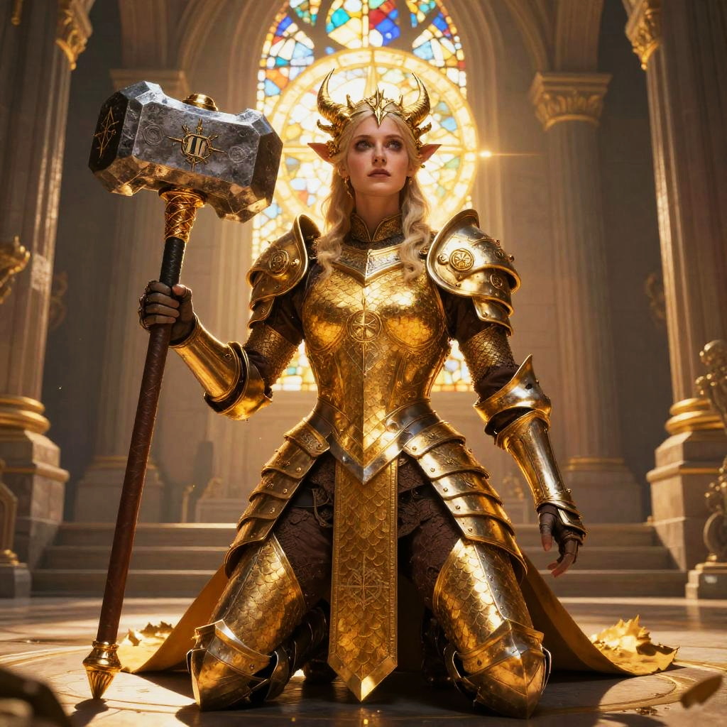 Digital artwork of a silver-haired, horned elf queen in shiny silver armor and green scalemail, holding a glowing staff, with sunlight radiating behind