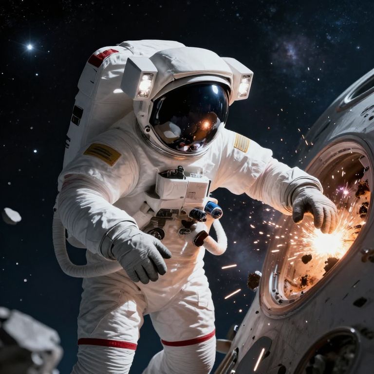 Astronaut in white spacesuit with reflective helmet, floating in space, sparks flying from damaged spacecraft window, against a starry background. Digital illustration