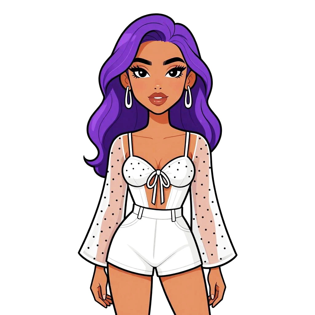 Woman with pretty face and pretty hair. Woman, contemporary chic, white romper with polka dot sheer overlay, sweetheart neckline, front tie cut-out at the bust, long sheer sleeves with flared cuffs, high-waisted shorts, silver dangling earrings, white background --sref 1461