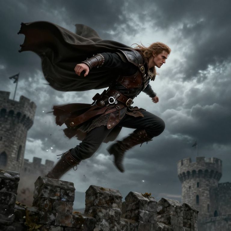 Rogue DnD art, charismatic rogue in dramatic mid-leap over castle battlements, flowing cloak, detailed leather gear with intricate buckles, dagger gleaming, dynamic action pose against stormy sky, fantasy epic style, focus on motion and tension