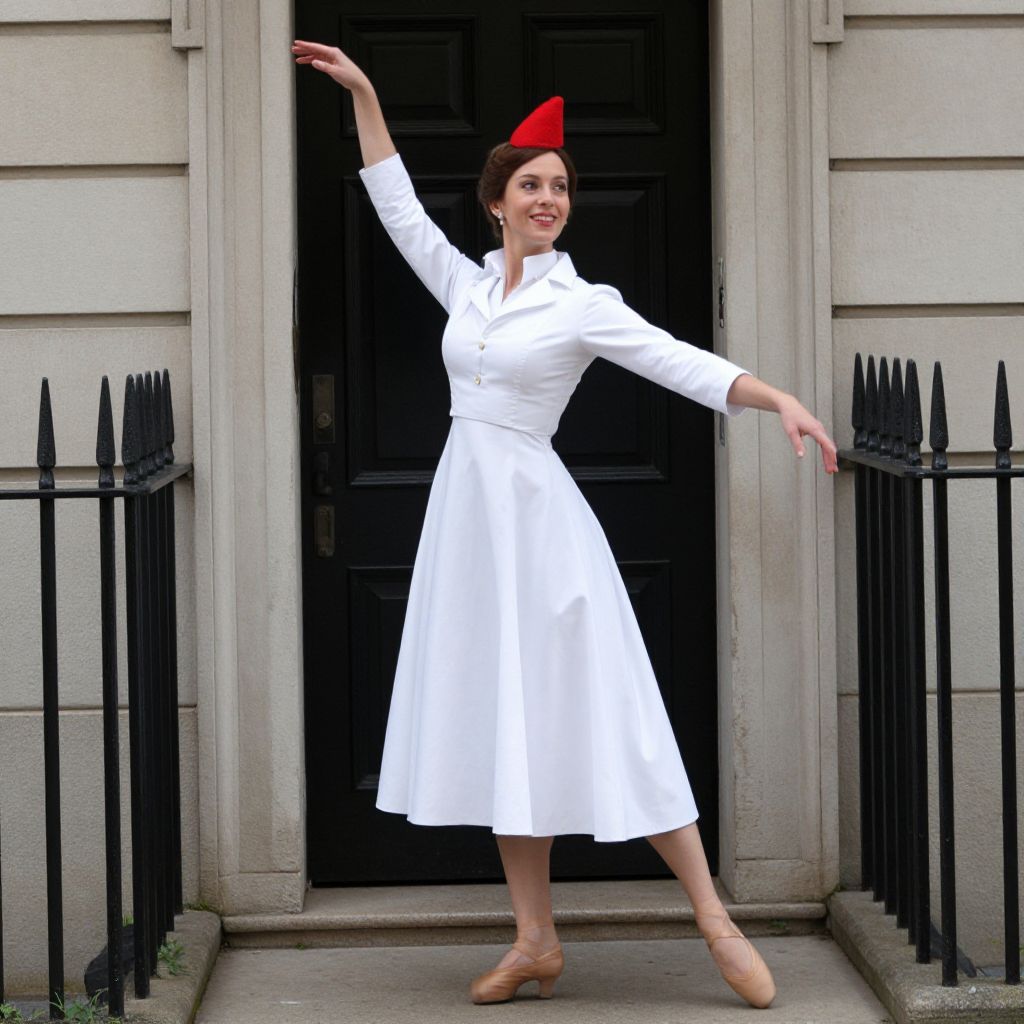 Mary Poppins Dance Costume, woman in white dress and red hat standing in front of a door