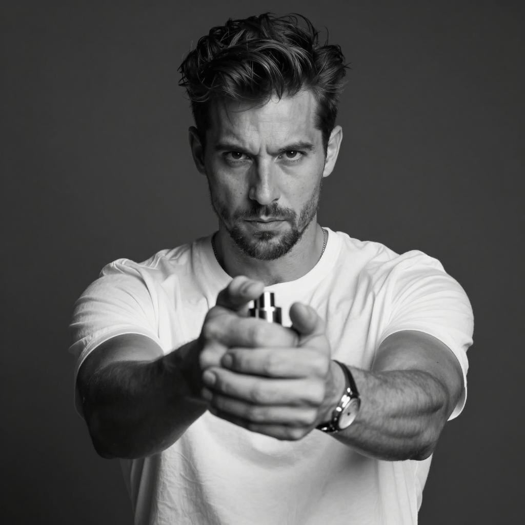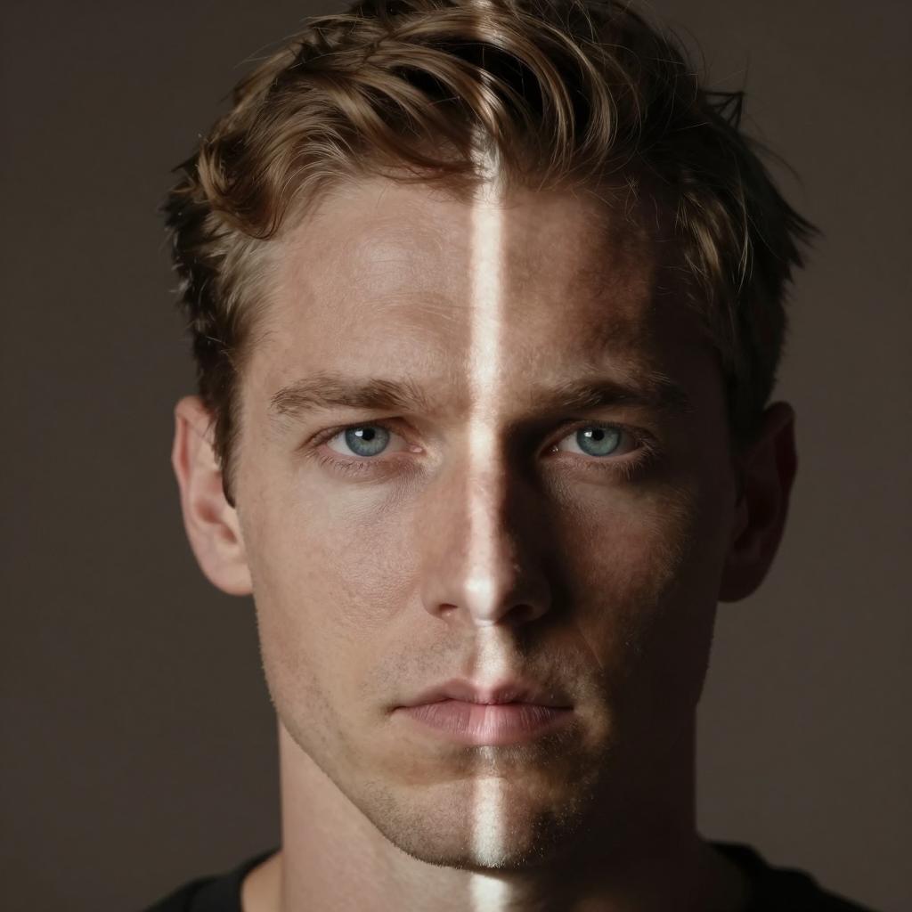 Photograph of a broken mirror fragment showing a close-up of a serious, intense-looking man with brown hair, brown eyes, and light stubble. The man's face is split by the jagged mirror edges, with a dark blue gradient background. The right side of his face is slightly illuminated, highlighting his features. The man's expression is determined and focused.