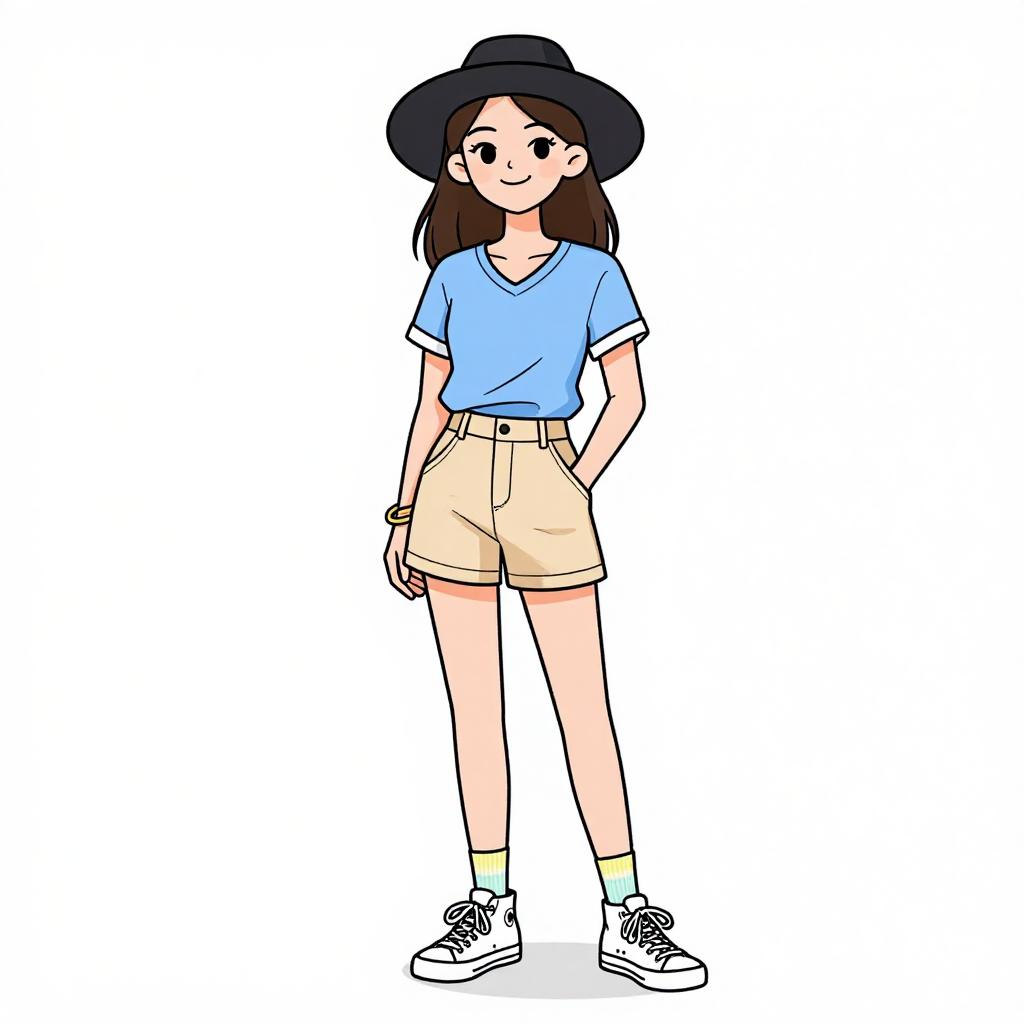 Digital illustration of a cute, young Asian girl with long brown hair, wearing a black hat, light blue t-shirt, beige shorts, white socks,