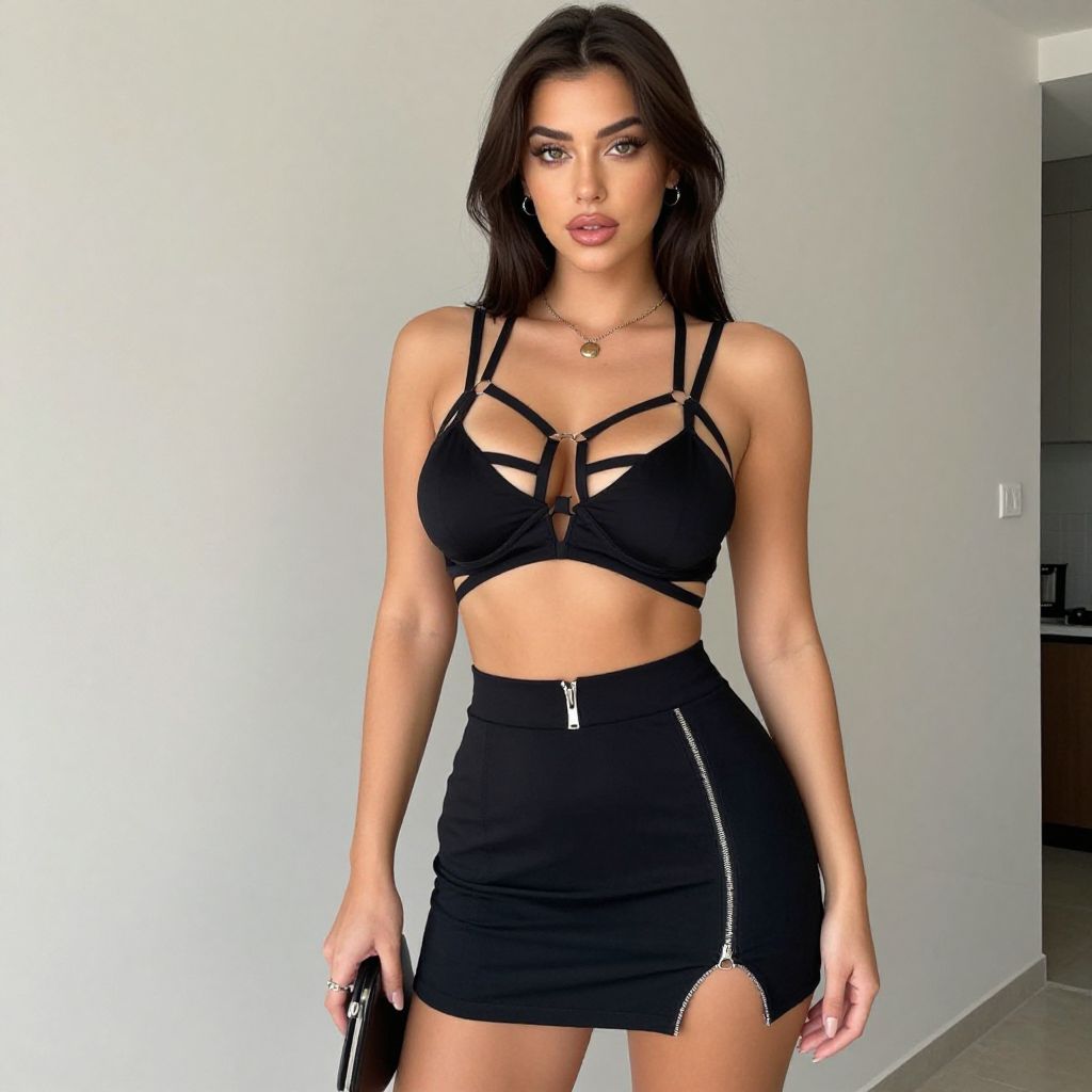 Photograph of a dark-haired woman with light skin wearing a black strappy bralette and high-waisted mini skirt with zipper, standing in a
