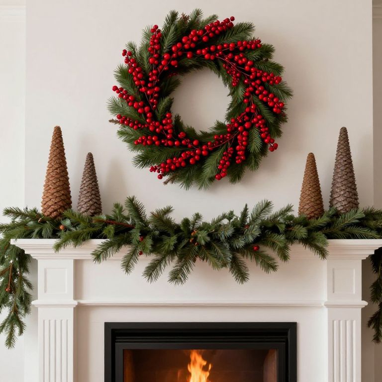 Cozy Christmas mantel adorned with a vibrant wreath of red berries and green foliage, flanked by four textured cone-shaped ornaments and a lush evergreen garland, set against a white fireplace with a warm fire burning inside.