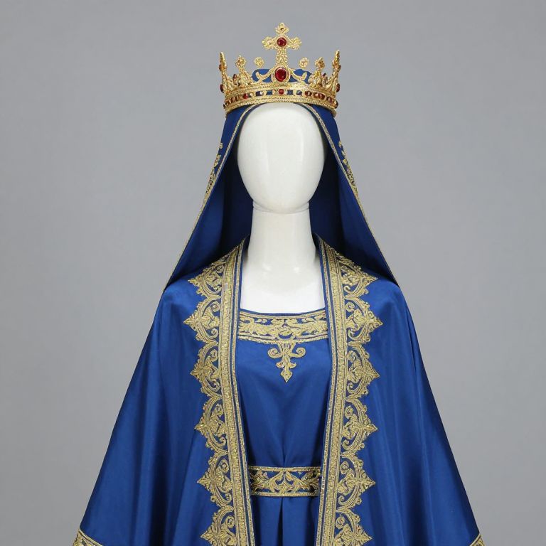 Mannequin wearing a white robe with gold embroidery and a gold crown on his head. He is standing in front of a ornate building with golden pillars.