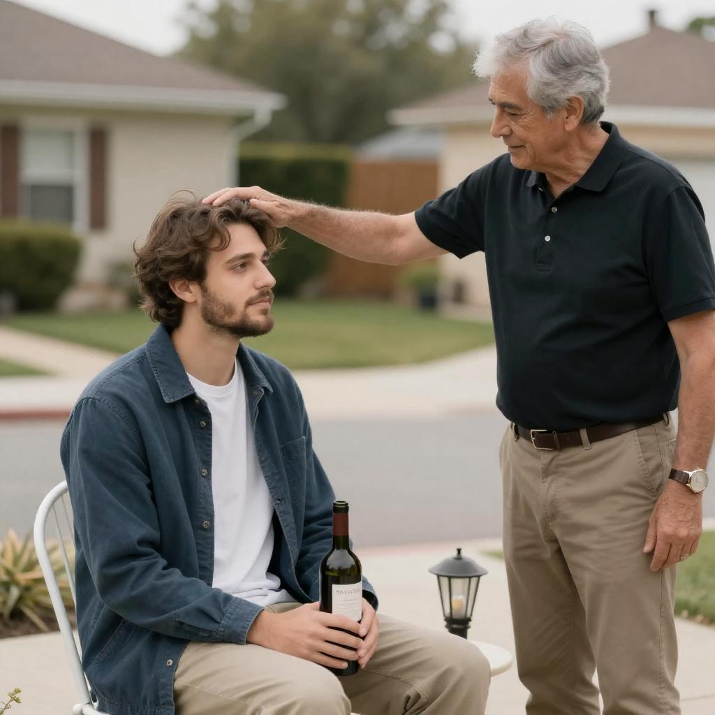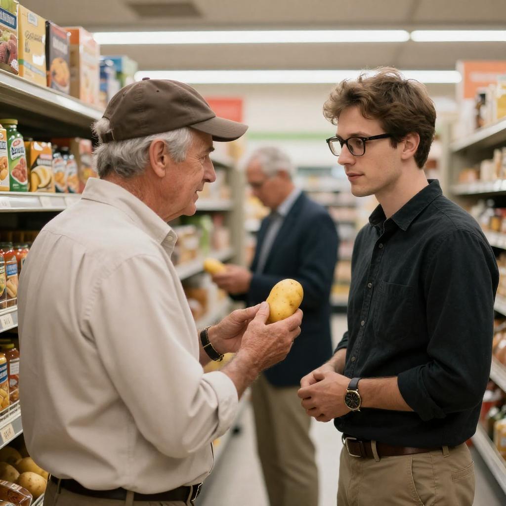 Photograph of a grocery store. Two men interact. Older man in beige shirt and brown cap holds a yellow potato, facing a younger man in black shirt and glasses, who looks at the potato. Shelves with boxed items in background. Older man's back to camera, younger man facing forward. Another older man in dark suit in background, focused on items. Bright store lighting.