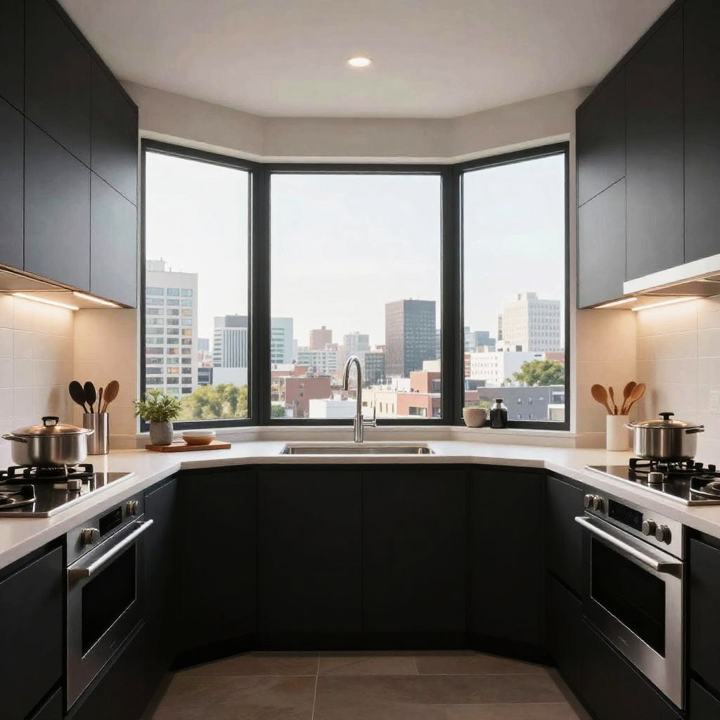 Contemporary corner window kitchen design showcasing black matte cabinets, stainless steel appliances, expansive corner glass windows offering cityscape views, ambient LED lighting enhancing the mood.