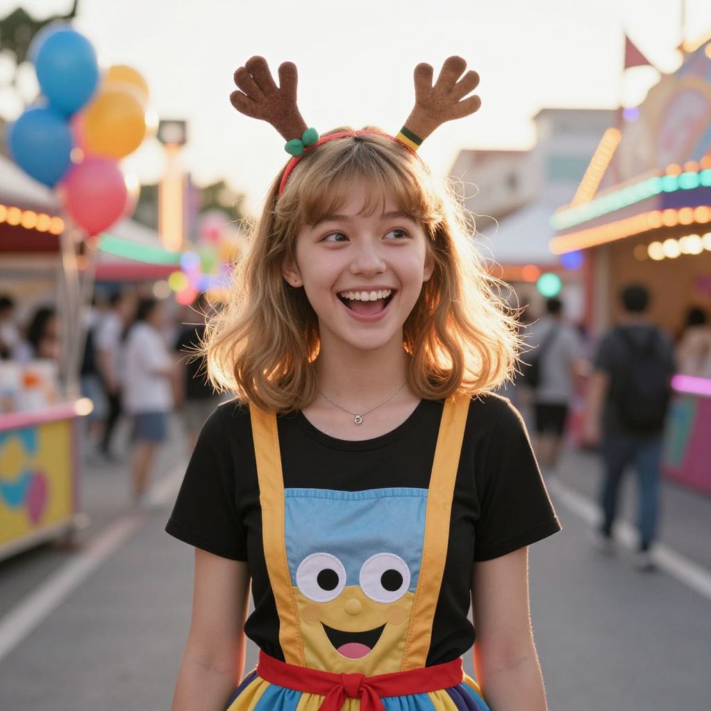 Photograph of a smiling young Asian woman with light brown, shoulder-length hair, wearing a black T-shirt with a Minion graphic on a blue apron, and colorful suspenders. She has brown antler headbands on her head. The background shows a lively outdoor carnival with blurred colorful lights, booths, and balloons. She stands in the foreground, centered, with a joyful expression. The image has vibrant colors and a cheerful, festive atmosphere.