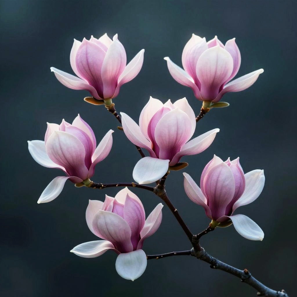 A vibrant digital painting of a magnolia branch against a black background. The branch features bright pink and white magnolia flowers with vivid green buds. The petals are delicately layered, and the colors pop against the dark backdrop, giving a striking contrast. The flowers are arranged diagonally from the bottom left to the top right.