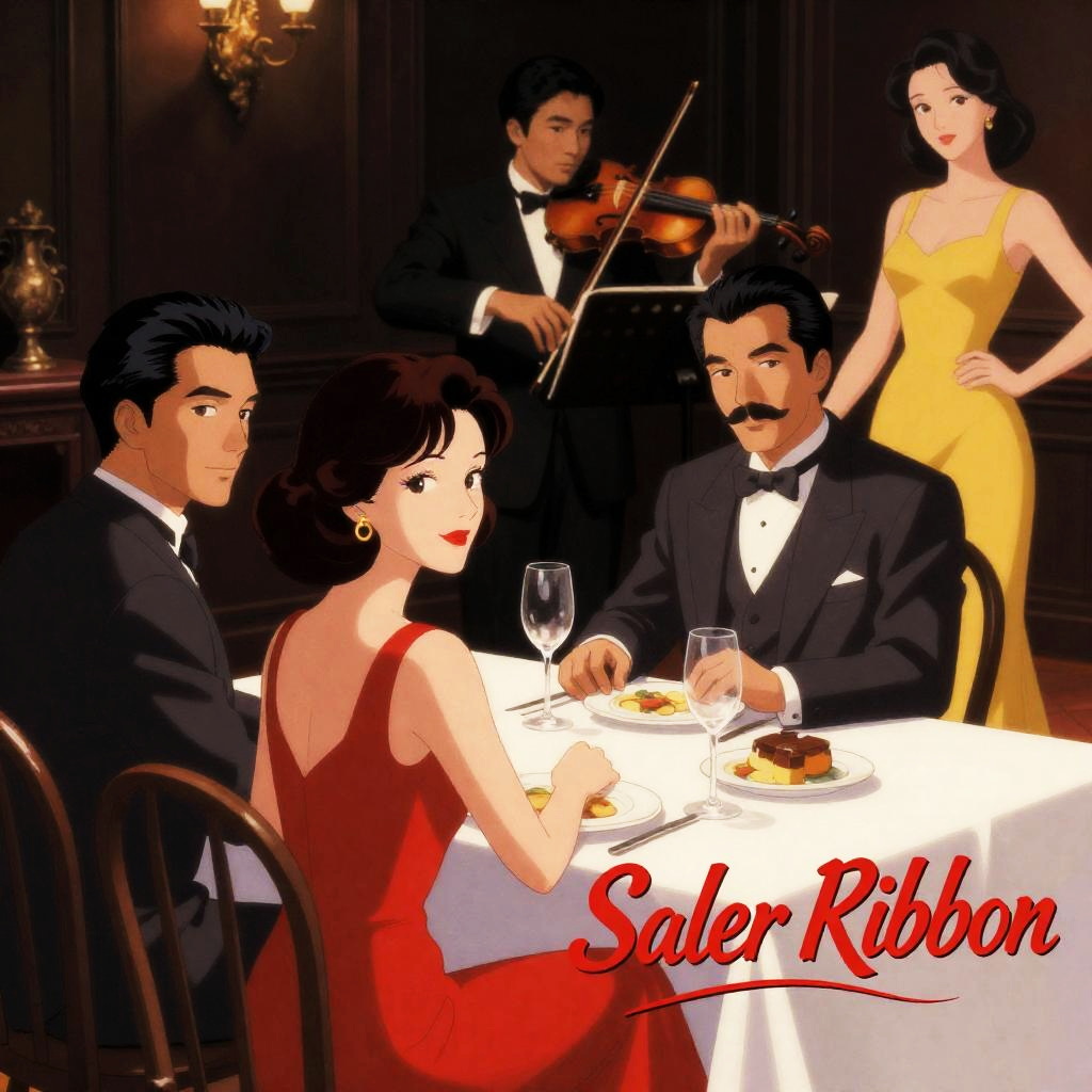 Movie poster illustration of a dinner scene. Three men in suits, one woman in a red dress, sitting at a table. A musician with a violin in the background. Yellow dress poster on the right. "Scarlet Ribbon" in bottom right. Woman in foreground smiling, man to her right with a mustache, man on left with short dark hair. Dark, elegant room.