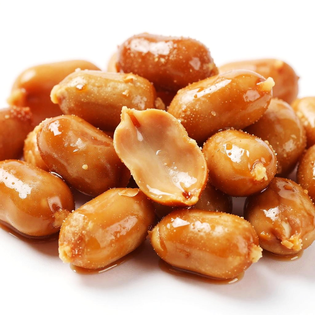 Close-up photo of a pile of glossy, caramel-coated peanuts. The peanuts are shiny with a deep brown, sticky glaze, and their orange-brown color is highlighted by the bright white background. The texture looks crunchy yet coated with a smooth, sugary layer. The image focuses on the pile of peanuts, with no other objects or people in sight.
