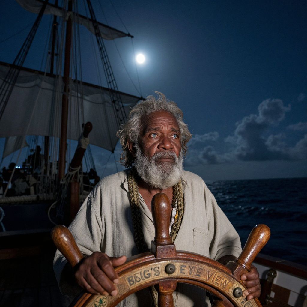 Elderly man with content expression and timid blue eyes, his graying beard illuminated by soft moonlight as he stands at the helm of a grand ship. Weathered features hint at tales of distant journeys and battles against storms, yet his demeanor exudes tranquility and wisdom. 'Bug's-eye view' captures not only this Aboriginal figure but also the majestic surroundings: towering masts silhouetted against starlit sky, sails swaying gently in breeze. Scene encapsulates emotional spectrum from calm ocean surface to turbulent depths below, mirroring intricate nature of human experiences.