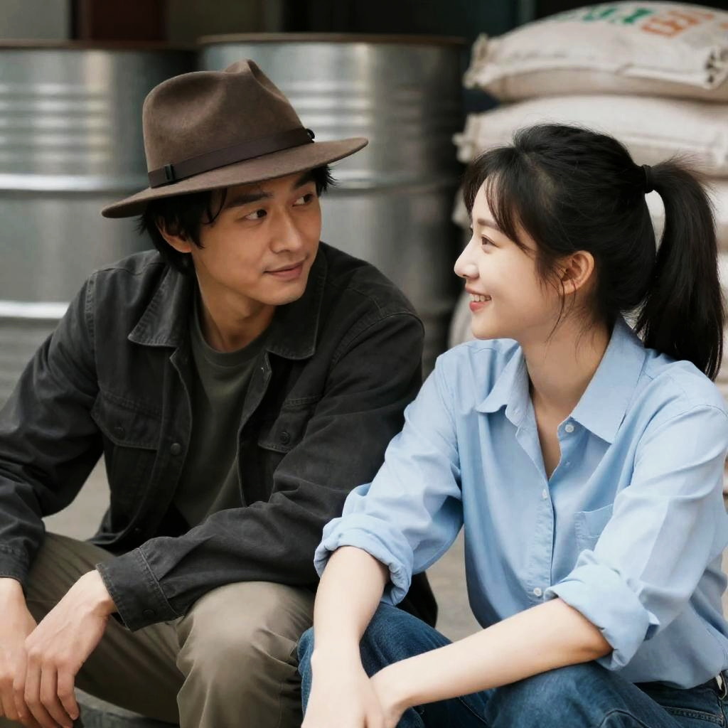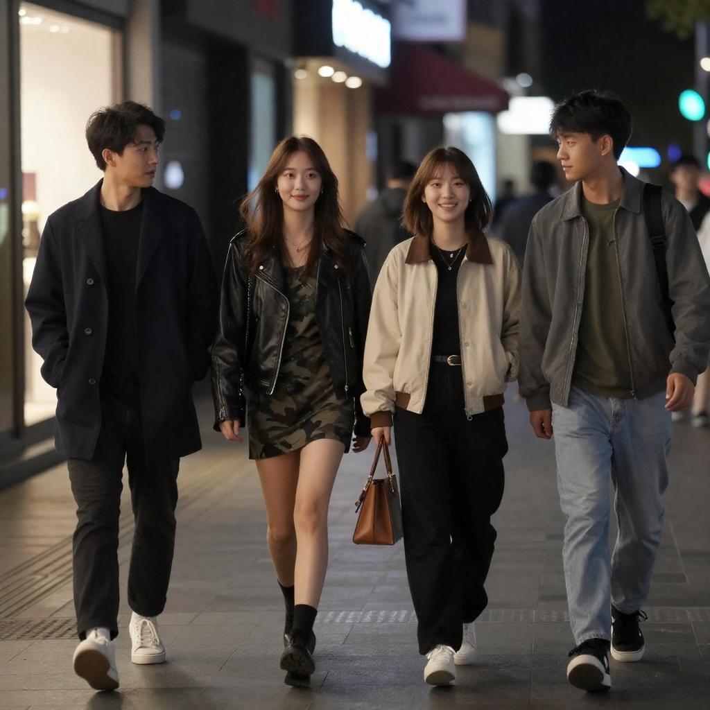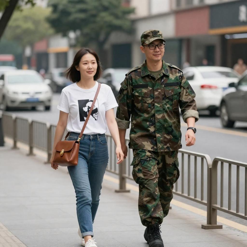 Photograph of two people walking on a city street. Male in camouflage uniform and cap, with glasses, holding female's hand. Female in white shirt with black graphic, blue jeans, brown satchel. Street with parked cars, metal railing, and storefronts. Female smiling, male smiling slightly. Green trees in background. Casual urban setting.
