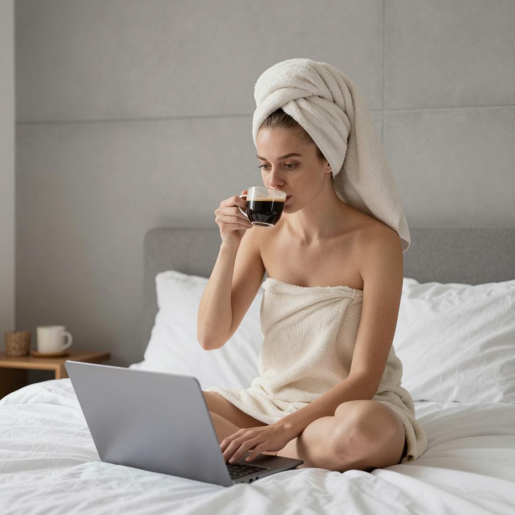 A relaxed young woman wearing a towel turban on her head, sitting comfortably in a cozy modern bed with white bedding, drinking coffee from a small cup while using a laptop, minimalistic bedroom with grey concrete wall and soft natural light, neutral tones with warm beige and white colors