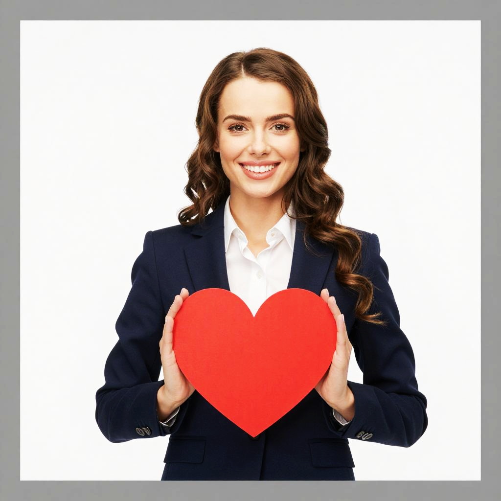 Photograph of a smiling woman with curly brown hair, red lipstick, and fair skin, holding a large bright red heart with her right hand while pointing at it with her left index finger. She's wearing a white sleeveless top against a stark white background, creating a playful and cheerful vibe. The image has a gray border on both sides.