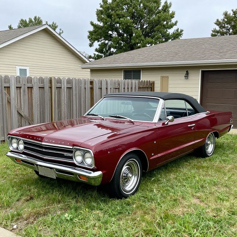 Shiny maroon 1966 Plymouth Fury III Convertible parked beside a suburban home, showcasing its classic design with chrome accents and soft-top roof, surrounded by green grass and a wooden fence.