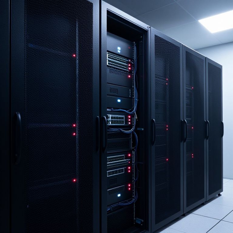 Photograph of a row of black, metal server racks with perforated fronts, illuminated by cool, blue-white fluorescent lighting. Each rack has multiple horizontal and vertical compartments, with red and blue LED indicators on the leftmost rack, suggesting active status. Cables are neatly organized, some coiled and others running vertically. The background features a clean, white-tiled floor and ceiling, enhancing the modern, technological setting. The overall scene conveys a high-tech, data center or server room environment.