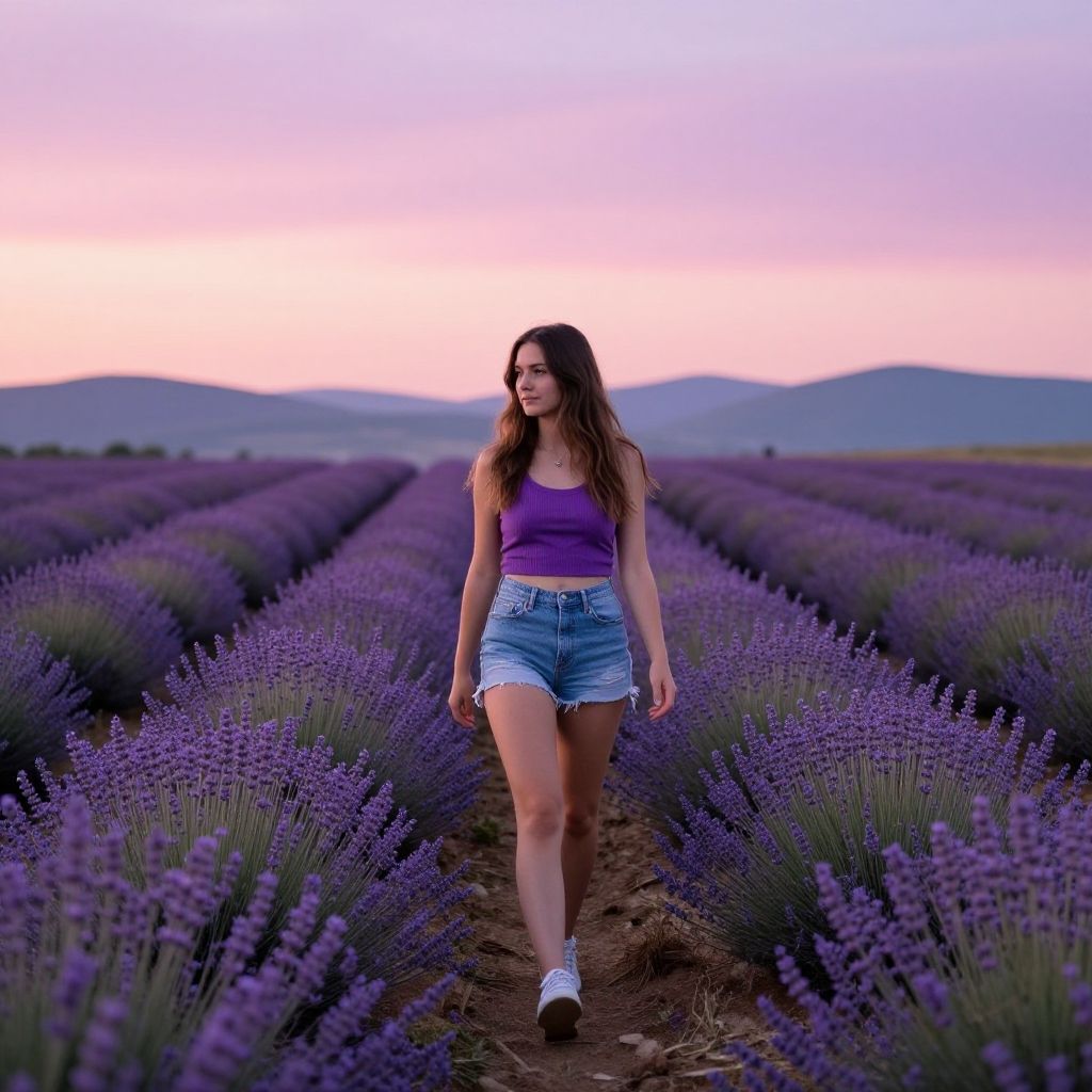 Photograph of a young woman walking through a vibrant lavender field at sunset. She has long, wavy brown hair and wears a purple tank top with high-waisted, light blue denim shorts and white sneakers. The lavender rows create a symmetrical path leading to distant, blue-hued hills under a pink and purple sky. Her relaxed, confident stride contrasts the vibrant purple of the lavender, and she looks slightly to the left with a calm expression. The ground is a mix of dirt and dried lavender stalks.