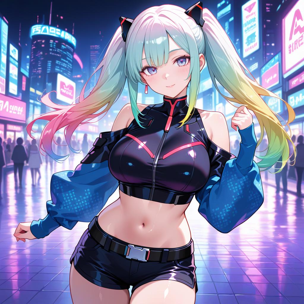 Digital illustration of a vibrant anime-style young woman with multicolored twintails standing confidently in a neon-lit urban setting. She wears a glossy black bralette with neon stripes, black shorts with a bold belt, and a colorful jacket slipping off her shoulders, revealing a bare midriff. The background features futuristic cityscape elements with glowing signs and reflections, emphasizing a cyberpunk noir atmosphere. Her bright blue eyes and eye makeup complement her energetic, playful pose and expression.