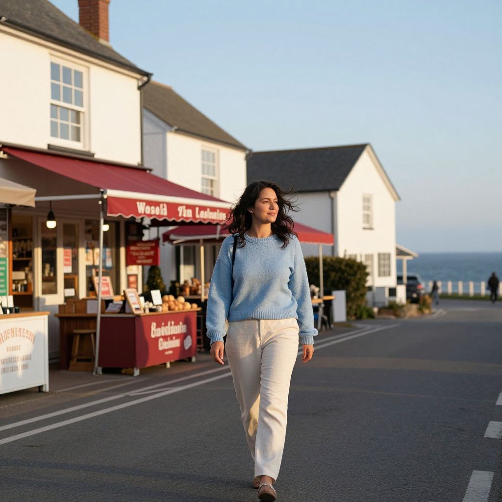 Photograph of a woman with long black hair, light skin, and a curvy build walking down a quaint street. She wears a light blue sweater and beige pants, with brown sandals. The background features white, two-story buildings with red and white striped awnings, including a bakery named "The Village Bakery." The street is lined with small shops, and the sky is clear and blue. The woman is centered, walking towards the camera, with a calm expression. The image has a slight HDR effect, enhancing colors and contrasts.