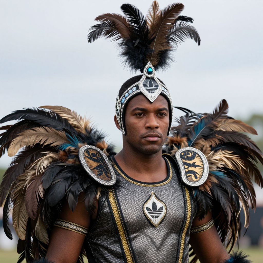Photograph of a Black man with a medium-dark skin tone, wearing an elaborate traditional headdress with black and brown feathers. He has a serious expression and is dressed in a metallic gray shirt adorned with gold trim and a large white emblem with a black arrow in the center. His shoulders are covered with black and brown feathered adornments. The background is slightly blurred, showing a clear, light blue sky and some greenery. The headdress features a central turquoise stone. The image has a vibrant, colorful style with sharp details on the feathers and metallic elements.