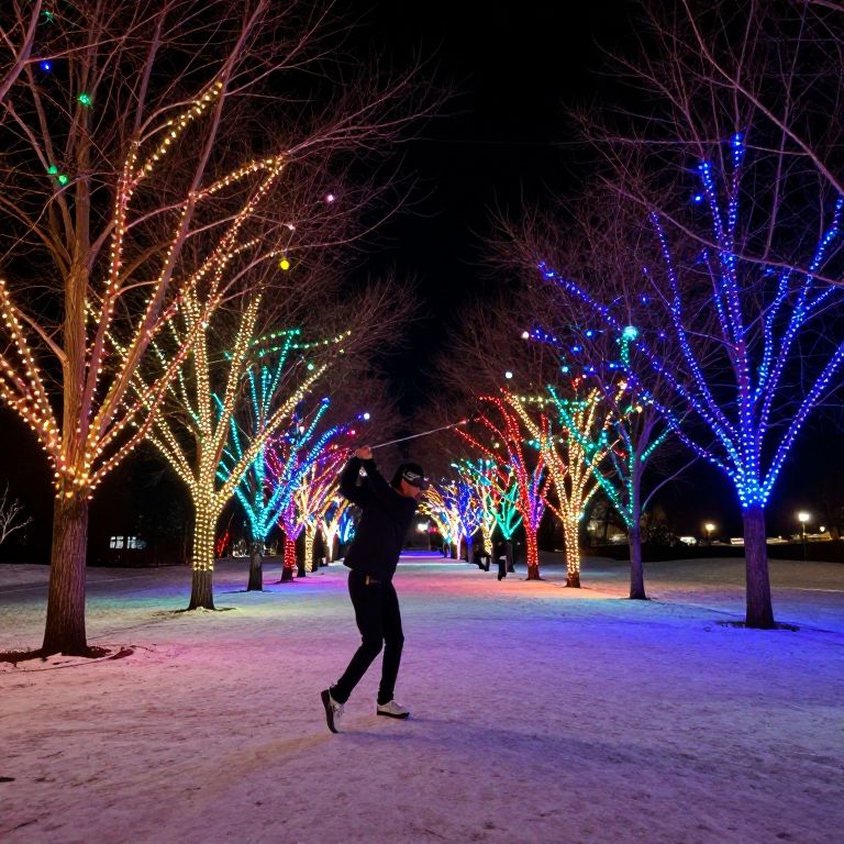 Golfers practice their swings under a mesmerizing canopy of colorful fairy lights illuminating bare trees, casting vibrant reflections on the snow-covered ground beneath a dark night sky.