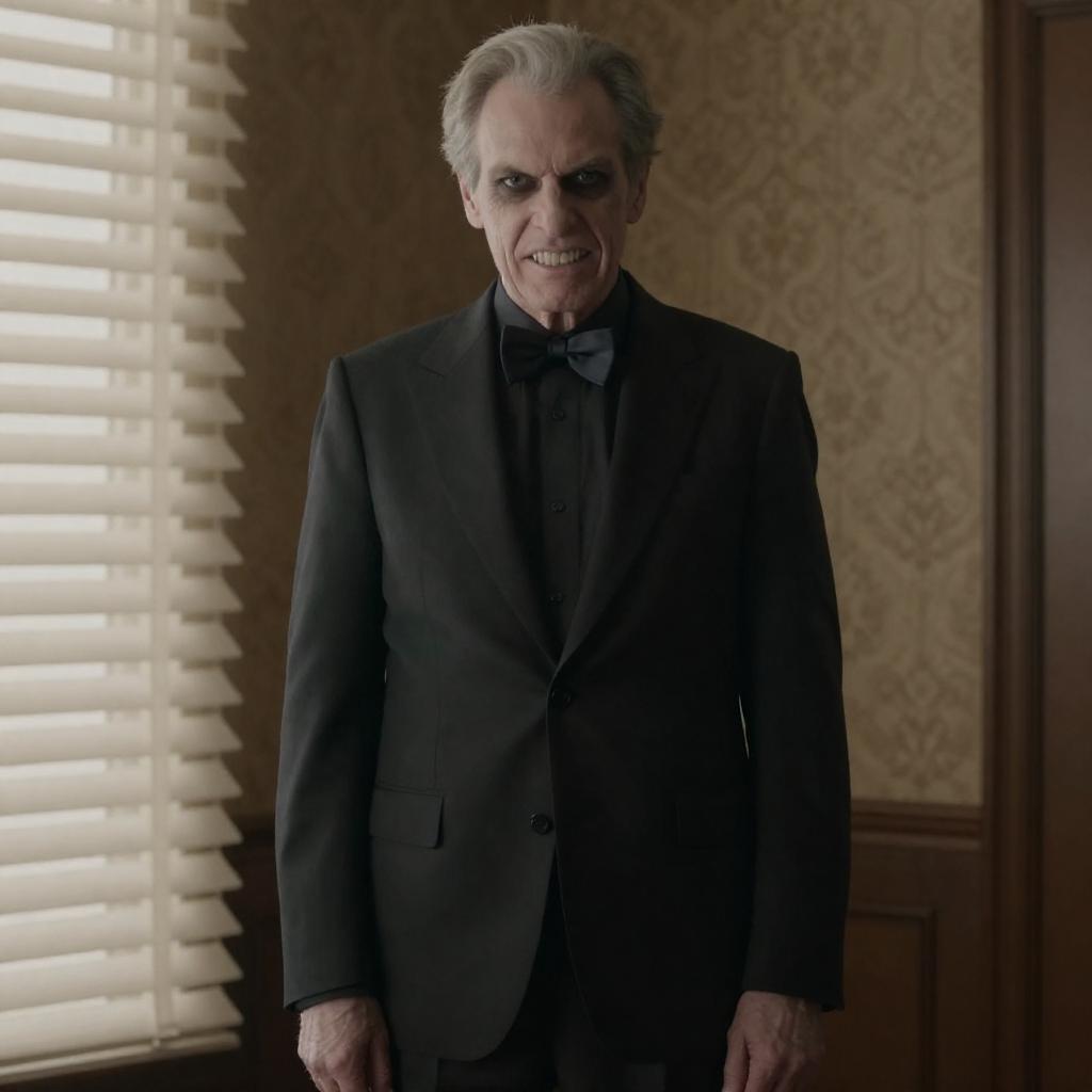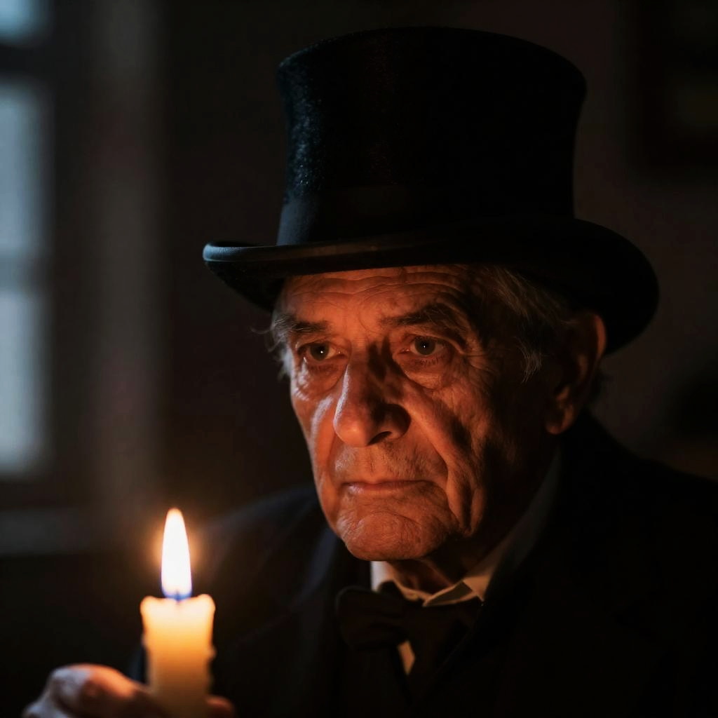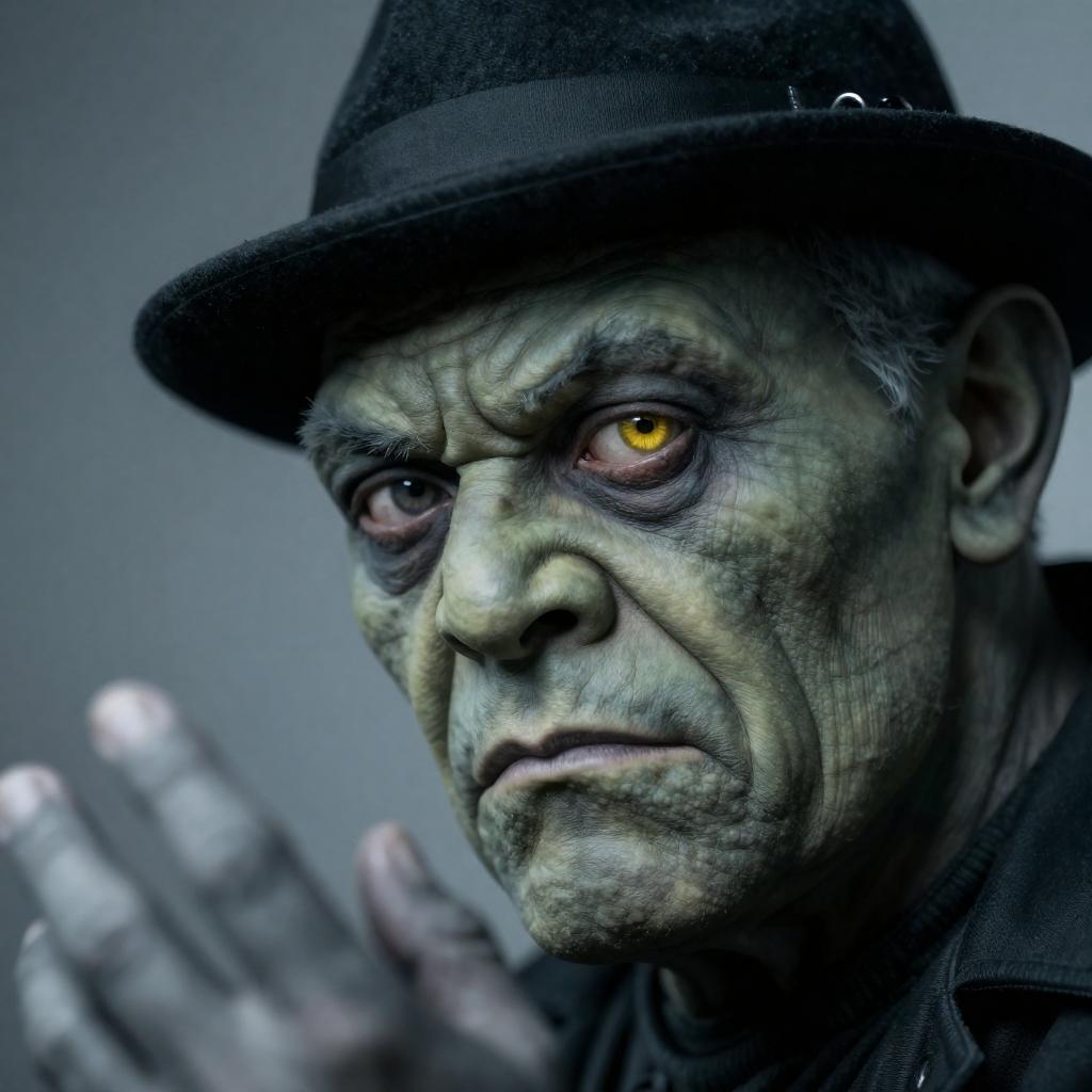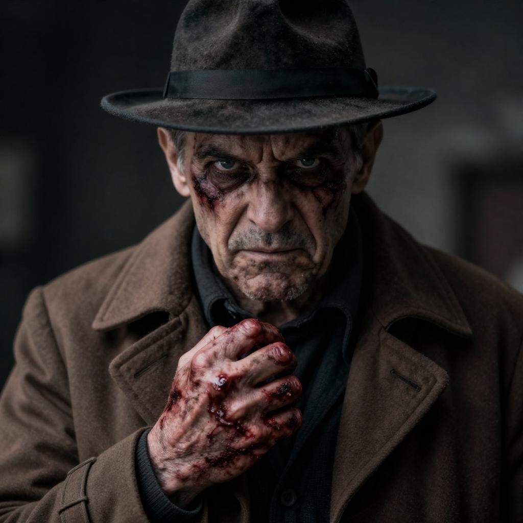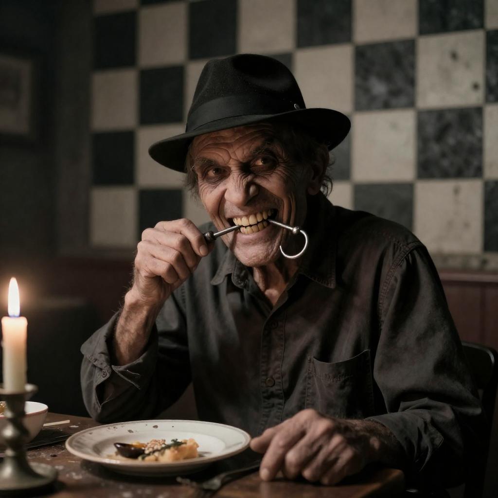 Photograph of a grotesque, aged man with a wide, menacing grin, wearing a black fedora and dark shirt, holding a metal hook in his mouth. He sits at a cluttered table with dishes, a candle, and a checkerboard-patterned wall in the background. His face is heavily wrinkled and ured. The setting is dark and industrial.