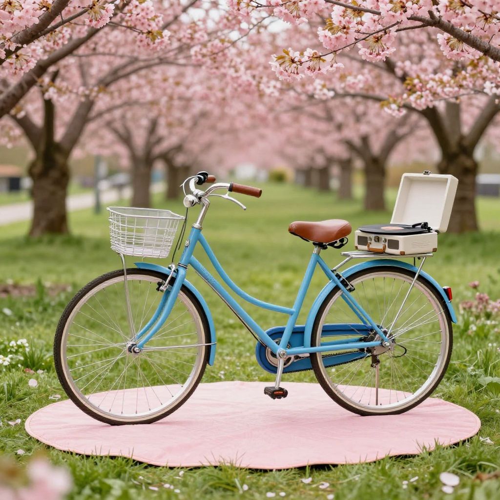A sky blue vintage bicycle with brown leather seat and handlebars styled in Art Deco design is parked on a pink circular mat in a vibrant garden. The garden is surrounded by blooming cherry blossom trees with pink flowers and lush green grass. The scene includes a picnic area with a vintage record player placed on the bike rack, creating a nostalgic and peaceful springtime atmosphere.