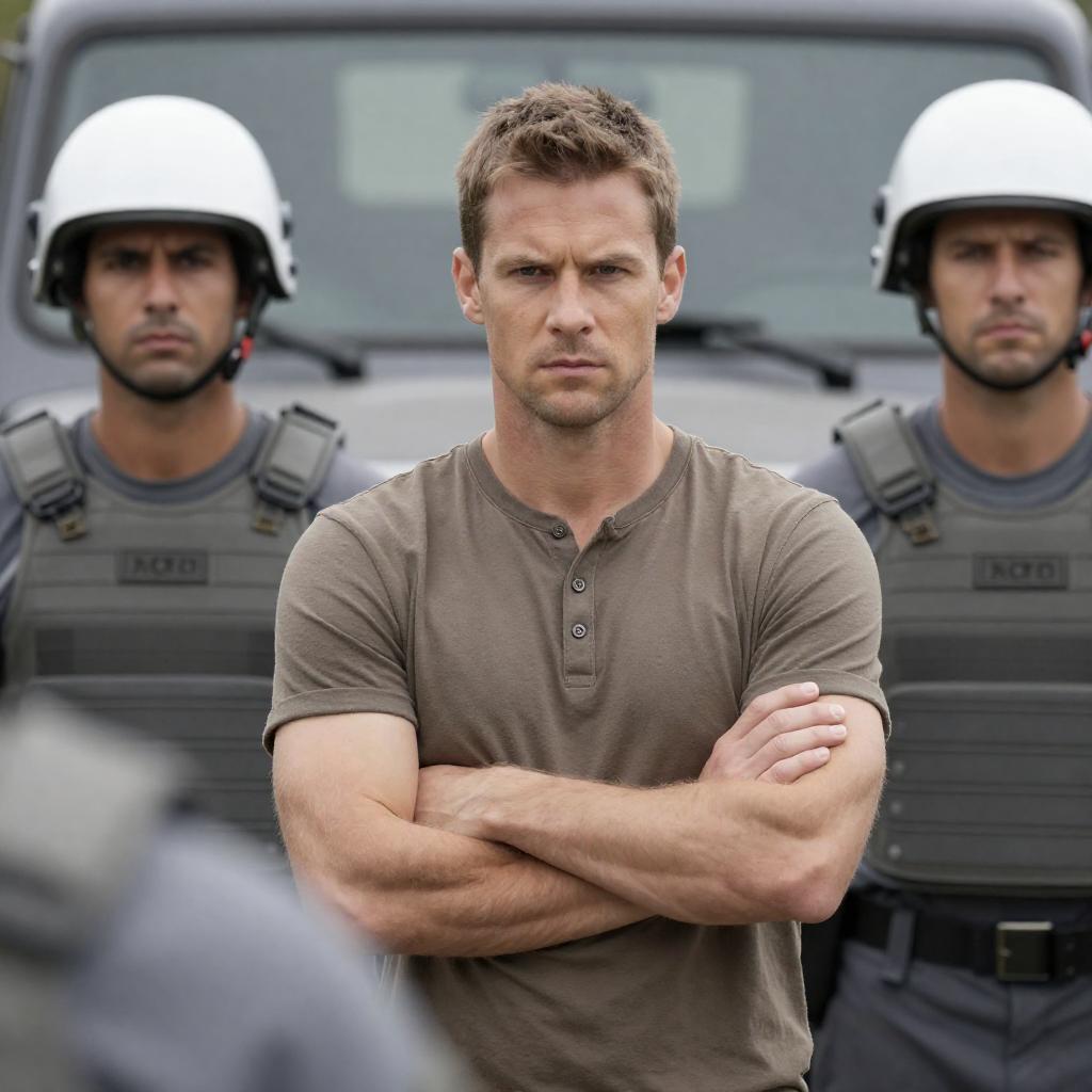 Photograph of two men, close-up. Man in foreground, blurred, brown hair, surprised expression, fist raised. Man in background, sharp focus, brown hair, intense blue eyes, serious expression, wearing dark shirt. Both men have rugged features. Green blurred background.