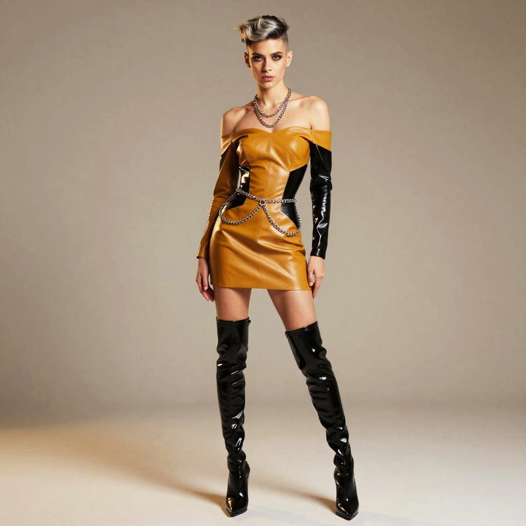 Image in the style of Egon Schiele Expressionist Fashion Illustration, intense avant-garde sculptor, greasy short auburn quiff, angular lanky frame, (Leather & Latex Off-Shoulder Dress:1.3), distressed charcoal leather off-shoulder mini dress with matte-latex corset panels, oil-black thigh-high latex boots, sculptural metal neckpiece, raw plaster atelier with scattered sculptures and warm tungsten light studio background