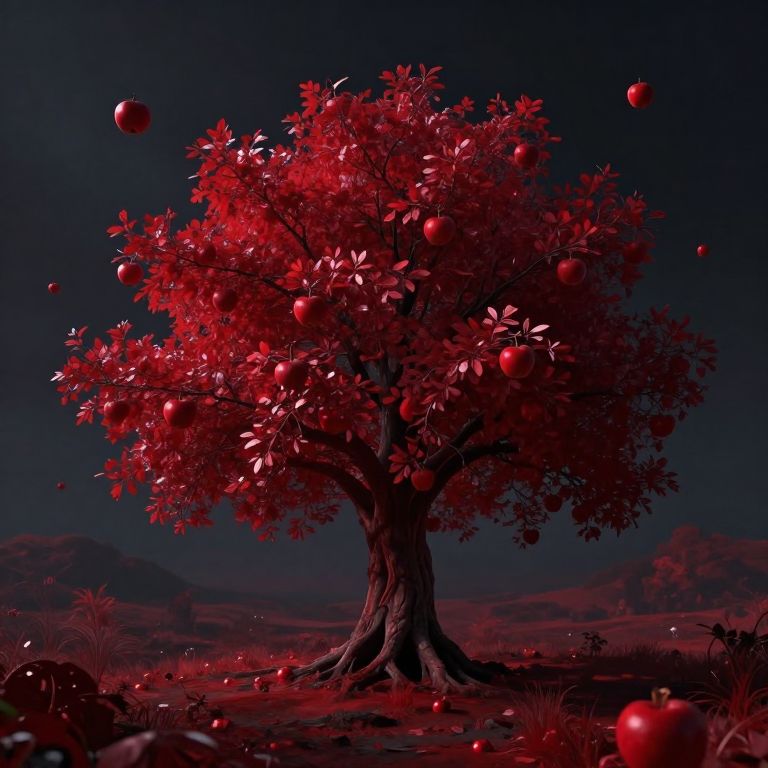 An otherworldly crimson apple tree, rendered in a surreal digital art style, stands rooted in a dark, ethereal landscape, its vibrant red foliage and floating apples creating a hauntingly beautiful, dreamlike scene reminiscent of a cyberpunk fantasy.