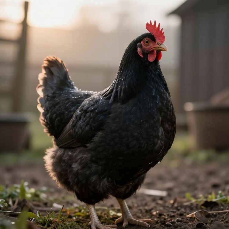 Fat black chicken surrounded by autumn leaves on a countryside path, soft golden hour sunlight, moody and atmospheric, hyper-realistic 3D render