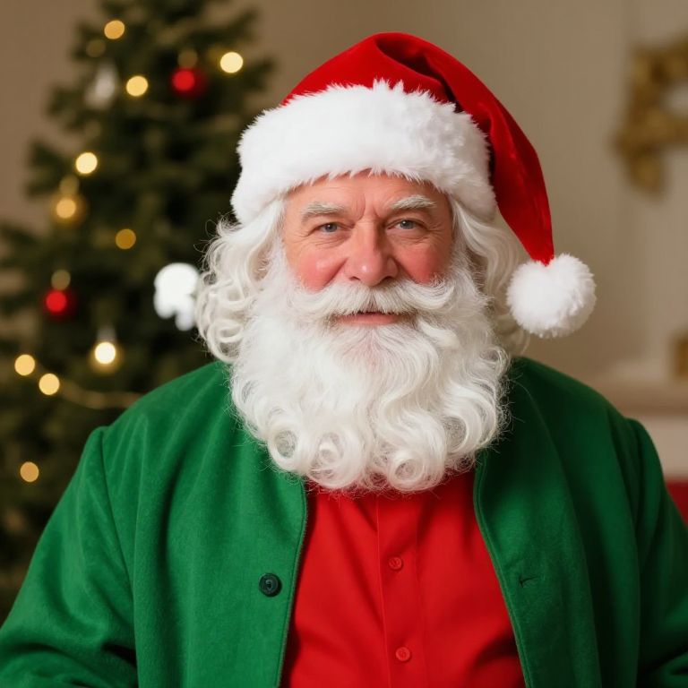 Male santa claus with a white beard and red shirt. He is wearing a green coat and a red and white hat. In the background, there is a Christmas tree with gold and red lights.