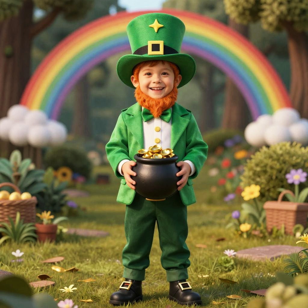 Leprechaun costume child smiling happily, dressed in festive green jacket and buckled shoes, holding a small pot of gold, with a rainbow and whimsical forest in the background