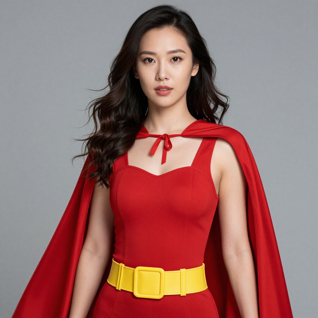 Female model wearing a red superman costume with a red cape and a yellow belt.