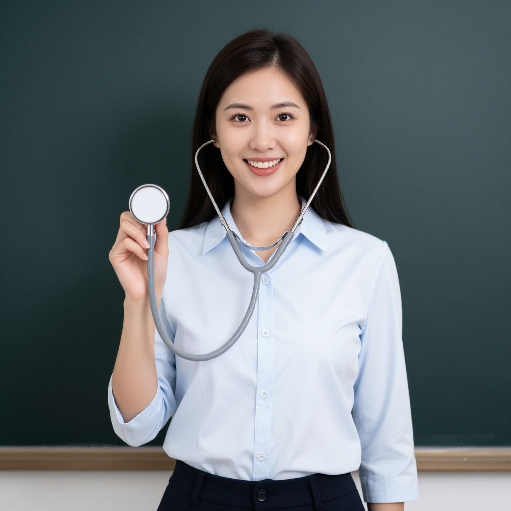 "Teacher Pun, woman with a stethoscope in front of a blackboard"