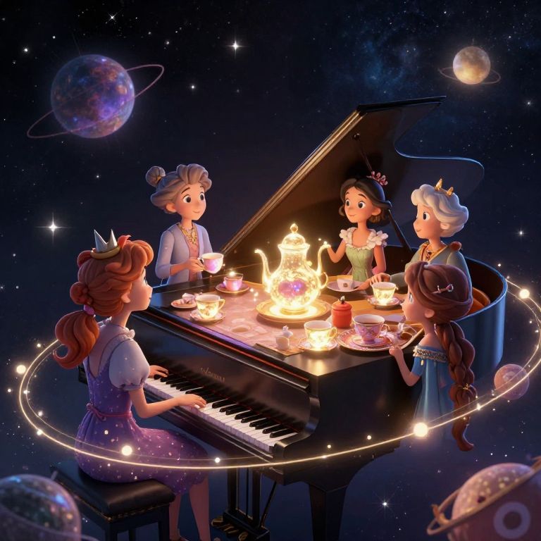 Digital artwork depicting an enchanting tea party atop a grand piano floating in outer space. Five animated characters, including humans and fantasy figures wearing elegant and royal-like clothing, gather around glowing teacups and a luminous teapot. The scene is surrounded by orbiting planets, stars, and luminous light strands creating a magical and dreamlike cosmic atmosphere.