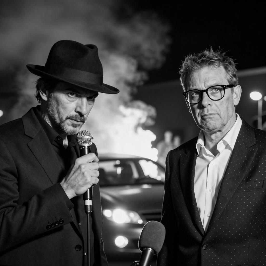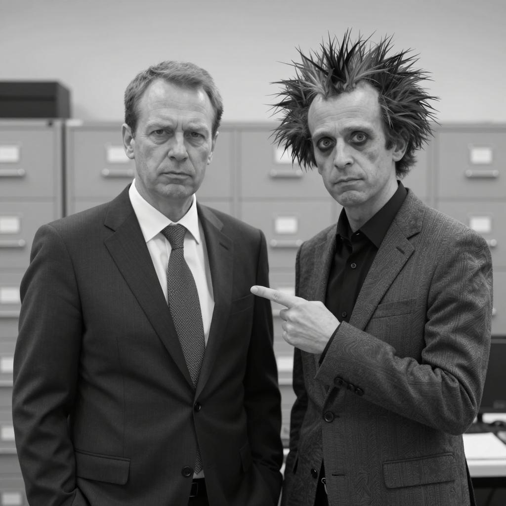 Black-and-white photograph. Man in suit with tie, short hair, serious expression, stands left. Person with large, bald head covered in spiky, feather-like ure, pointing, stands right. Office setting, filing cabinets in background.