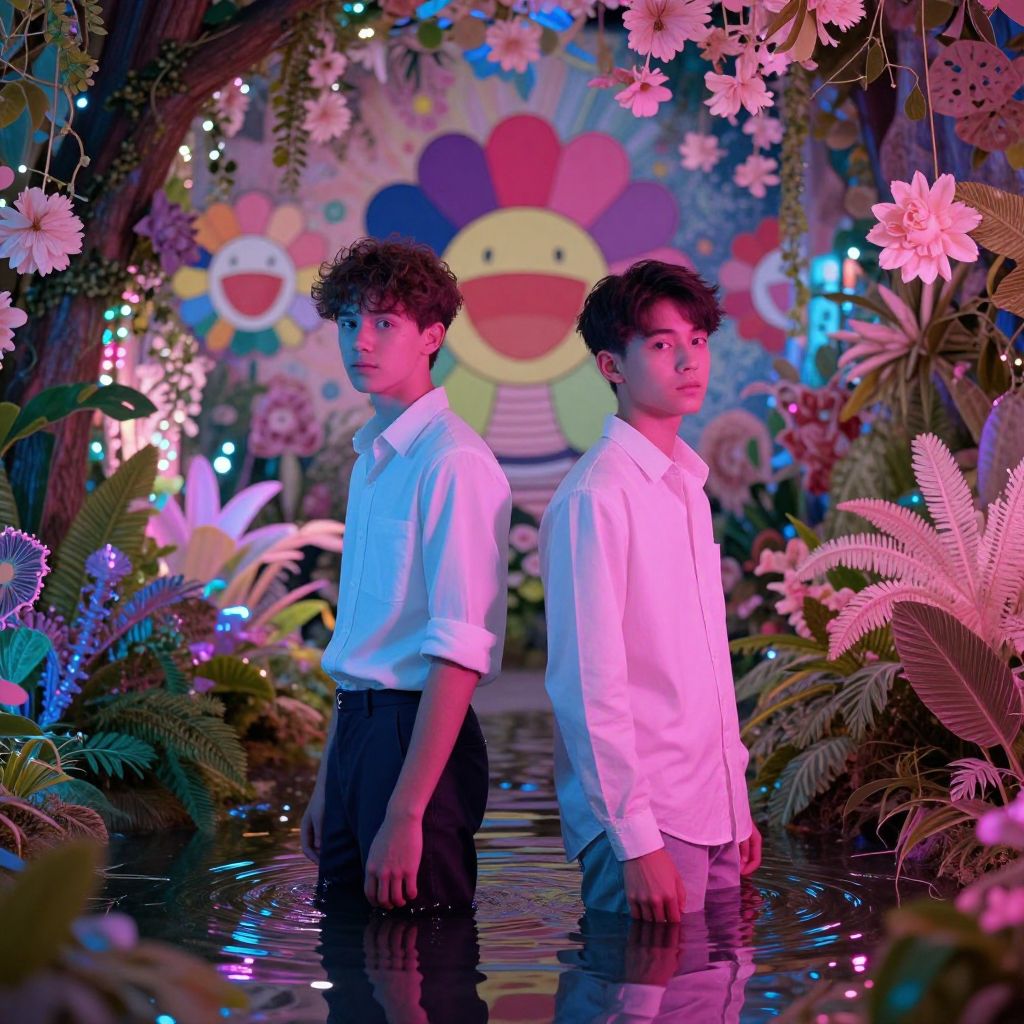 In this visually striking image, a neon white, biblically accurate 17-year-old boy model exudes an air of high class and richness as he floats over a puddle in a fantastical, neon-lit jungle. The scene is reminiscent of a 1970s film style, evoking the ethereal and otherworldly atmosphere of George Melies' films. The boy, dressed in a pristine white suit, lies on his stomach, his face illuminated by the soft glow of the surrounding fairy lights. The vibrant pink and green hues of the neon lights create a dreamlike, almost surreal ambiance, reflecting off the water's surface and enhancing the ethereal quality of the scene. The spatial arrangement of the lights and the boy's position suggest a sense of depth and movement, as if he is suspended in a moment of suspended animation. The overall composition is balanced, with the boy centrally positioned, drawing the viewer's eye to his contemplative expression and the intricate interplay of light and shadow.