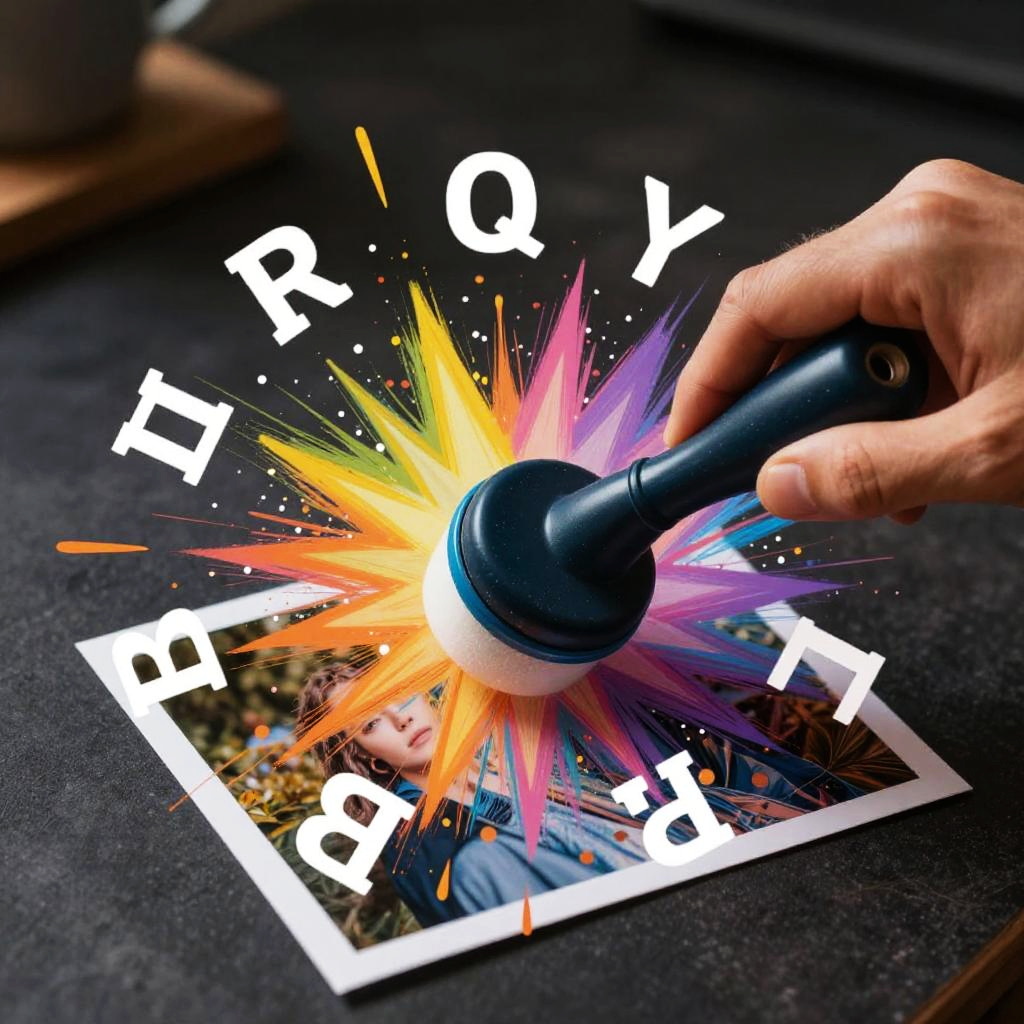Stock image watermark remover visual metaphor, a magical eraser wiping away watermark symbols from a photo, vibrant colors, dynamic brush strokes, artistic style blending digital and traditional art, set against a dark blurred background for contrast