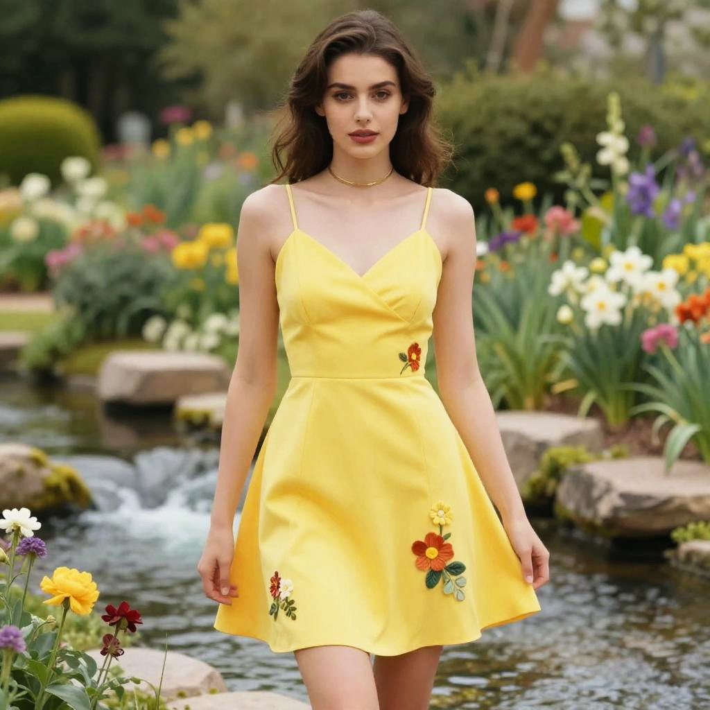 A lean woman in a vibrant yellow A-line mini dress with a V-neckline and floral appliqués, minimalistic gold choker, stands in a flower garden beside a babbling brook, captured in a vibrant, painterly style. Sexy. Pretty face and beutiful eyes