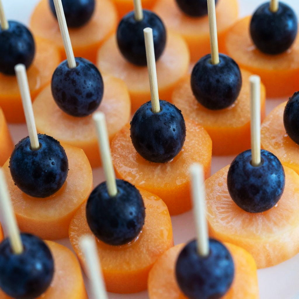 A colorful, close-up photo of twelve orange bell pepper cups filled with blackberries, each secured with a wooden toothpick. The bell pepper cups are arranged on a bed of fresh green lettuce leaves, creating a vibrant and appetizing presentation. The background is a clean white, making the bright colors of the peppers and lettuce pop.