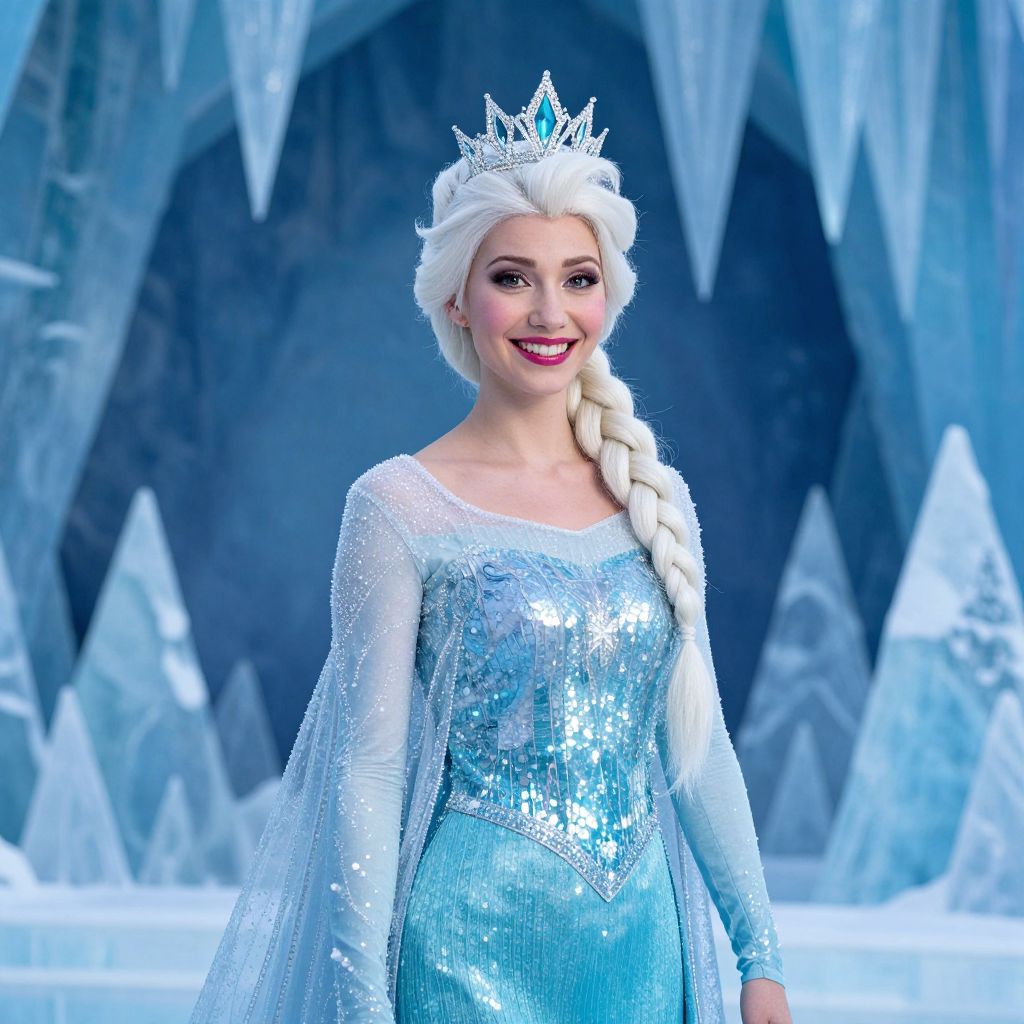 Photograph of a smiling woman dressed as Elsa from Frozen. She's wearing a sparkling, ice-blue gown with a sheer white cape and a silver crown. Her long, white braided hair is adorned with the crown. The background features an icy, blue-hued cave with jagged ice formations. The overall vibe is magical and wintry.