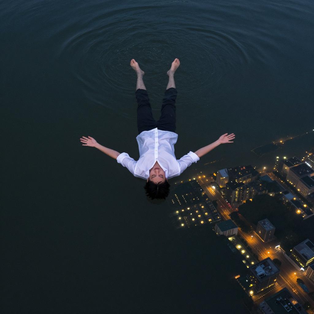 Aerial view of a person floating in dark blue water, arms and legs spread out. Below, a city lights grid illuminates the water's surface. Person wears a white shirt and dark pants. Water is murky with subtle ripples.